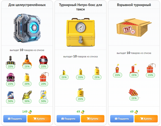 Cada caixa de saque contém itens úteis que certamente serão úteis durante: a conclusão de ordens, torneios e corridas. A caixa de saque indica a presença e a quantidade de itens que você pode obter ao comprar uma caixa de saque.