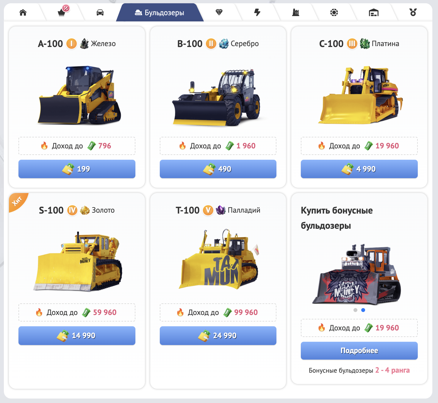 Чем выше уровень модели Вашего бульдозера, тем более ценную руду он способен добывать: 1 уровень — железо, 2 уровень — серебро, 3 уровень — платина, 4 уровень — золото, 5 уровень — палладий. Биржа выкупает серебро дороже, чем железо; платину — дороже, чем серебро и так далее.