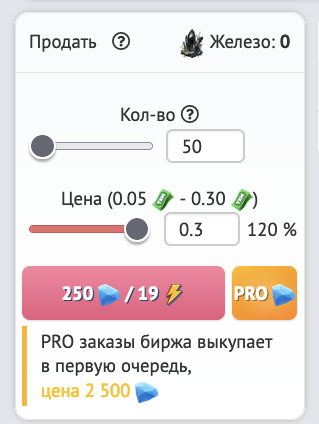 Установите цену и выберете количество которые Вы хотите продать. Учтите, что биржа выкупает в первую очередь PRO заказы и самую недорогую руду.
