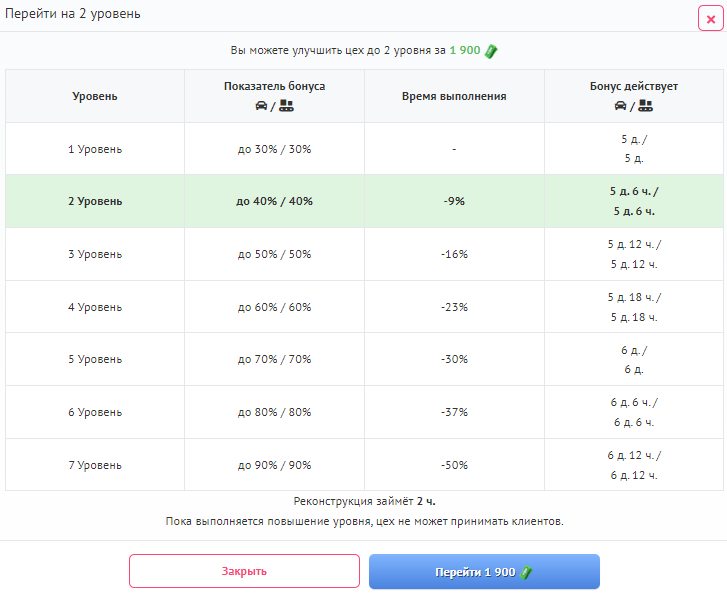 Для увеличения уровня цеха воспользуйтесь зелёной кнопкой со стрелкой в блоке соответствующего цеха или синей кнопкой «Повысить уровень» на странице настроек цеха.