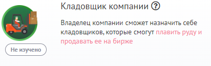 Бонус «Кладовщик компании» позволяет владельцу компании назначить кладовщиков, которые смогут продавать за него руду на бирже. 4 уровня бонуса позволяют нанять от 1 до 4 кладовщиков соответственно.
