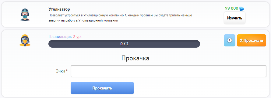 Изучите навыки утилизатора и плавильщика на странице профиля. Это обязательное условие для трудоустройства в любую Утилизационную компанию.