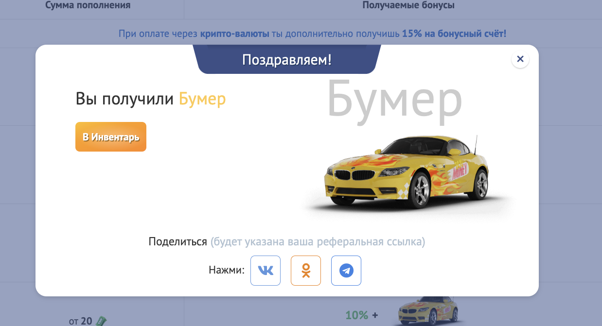 Все предметы, которые Вы получаете в игре отправляются в инвентарь. Например, получив такси в подарок за депозит, Вы увидите его в инвентаре