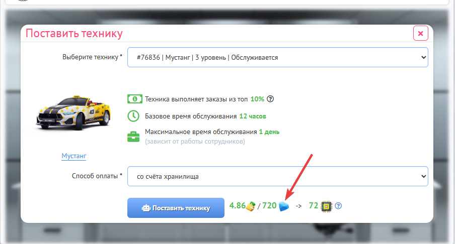 Вы устанавливаете свою технику в свободное окно. Чтобы установить технику нужно кликнуть “Поставить машину”