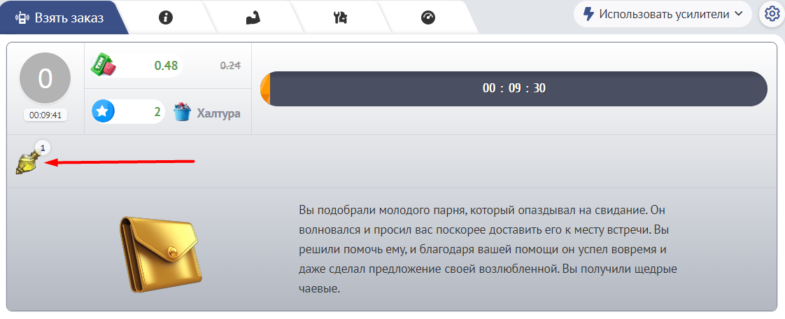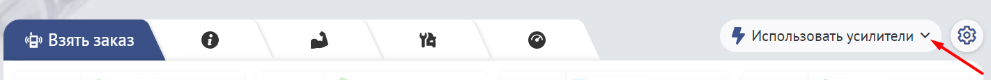 Усилители бывают разных типов, некоторые можно использовать во время выполнения заказов, другие до него, либо после. Для применения усилителей на странице выбора заказов, необходимо нажать на кнопку "Использовать усилители"