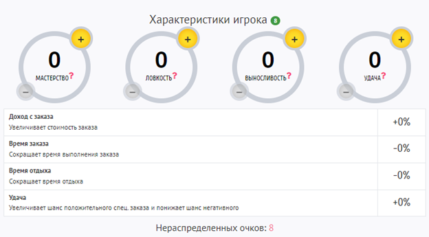 В профиле игрока имеются четыре характеристики, которые влияют на четыре основных показателя в игре: Мастерство, Ловкость, Выносливость и Удача. Каждую характеристику можно прокачать до 30 пунктов. Прокачивай игрока и получай больше дохода!