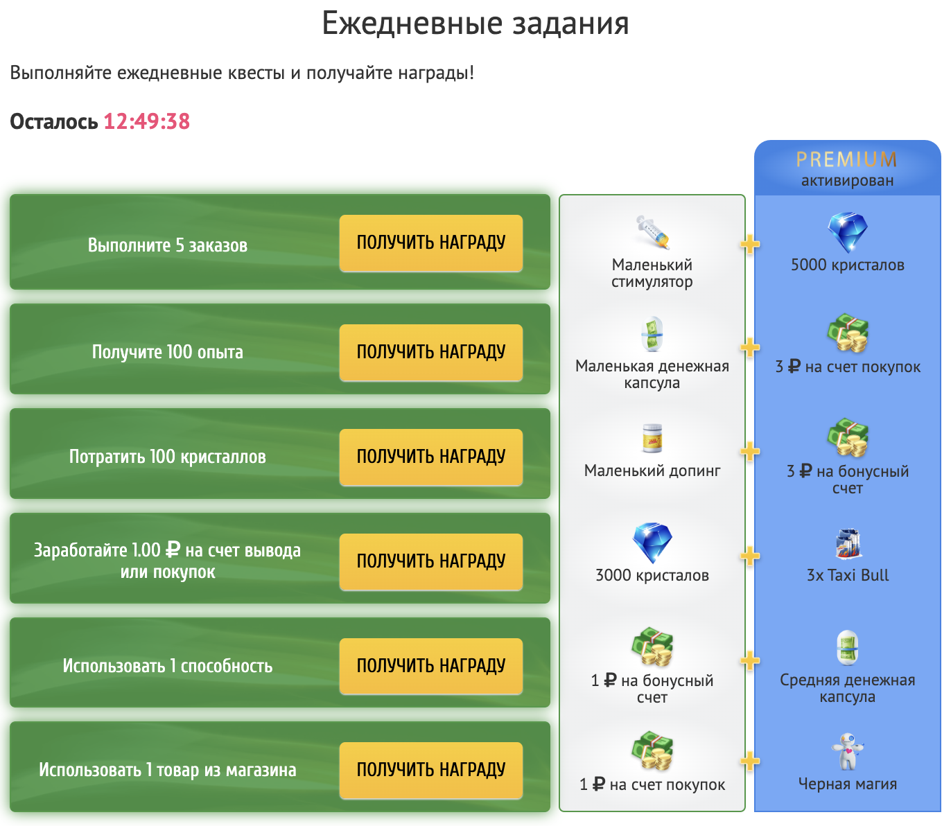 Выполняйте простые ежедневные задания, и получайте за каждое из них приятные бонусы! Это товары-усилители из магазина игры, кристаллы, а также денежные вознаграждения на внутриигровые счета!