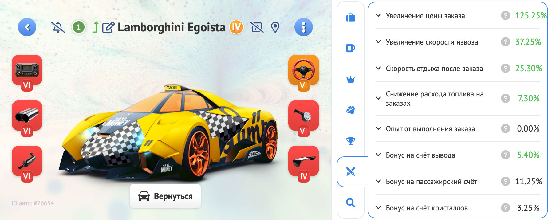 Причём, прокачку настраиваешь по своему выбору — можно под конкурсы, можно под турниры, можно под кристаллы, можно под обычный заработок, а можно в какой-то комбинированной стратегии заработка! И при необходимости предметы можно переносить с такси на такси. То есть изменять прокачку под любую другую стратегию!