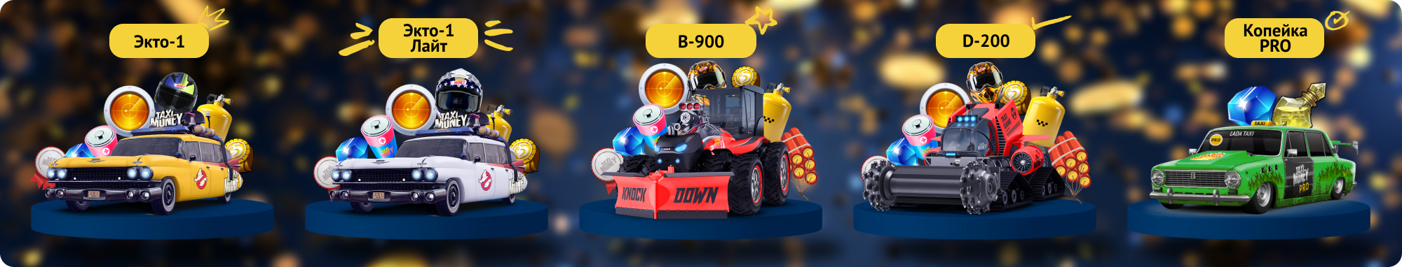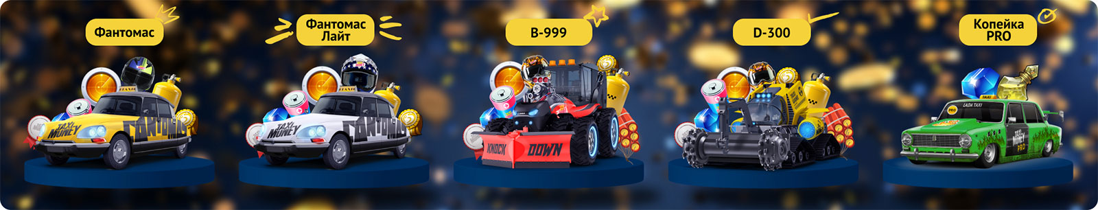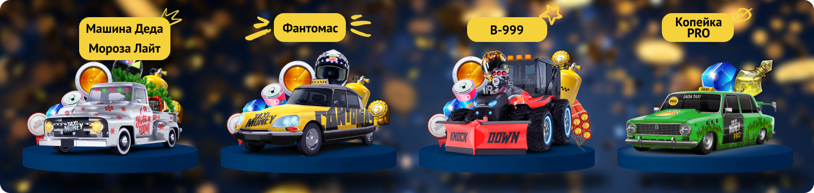 Новые беспроигрышные лотереи уже ждут тебя! В декабре и январе выигрывай за лотерейные монетки такси Машина Деда Мороза Лайт 4-го ранга, уникальное такси 3-го ранга Фантомас для потрясающих побед в Турнирах, лучшее такси для старта в игре Копейка PRO, а также флагманский бульдозер B-999 для заработка на 2-м ранге Горной добычи!
