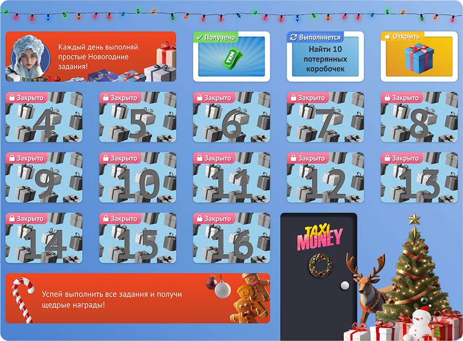 Новый год — это действительно время чудес и волшебства! Но чудеса и волшебство не случаются сами по себе! Только ты своими активными действиями можешь построить настоящее чудо! И с подарками от Taxi-Money сделать это будет гораздо легче и приятнее!